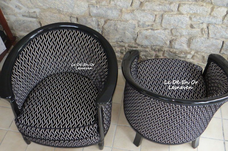 Magnifiques fauteuil tonneaux, black&white, teinte laquée noire, finition double passepoil noir.